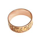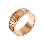 Зроблена з червоного золота 585 проби. Широка, досить масивна, гладка, з гарним рельєфним надписом «Спаси и Сохрани» по усій поверхні обручки. Такі каблучки дійсно часто стають весільними обручками для молодят, котрі усю свою надію та сподівання покладають на милість Божу! Демократична, і досить лаконічна, тому буде пасувати усім без винятку, легко поєднується з іншими золотими виробами, гарно впишеться у будь-який образ та гардероб.