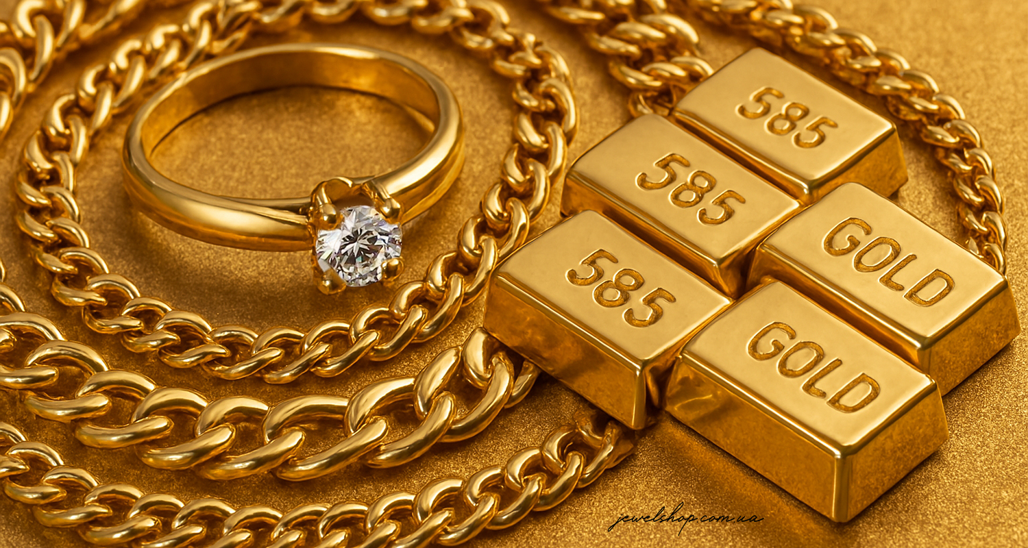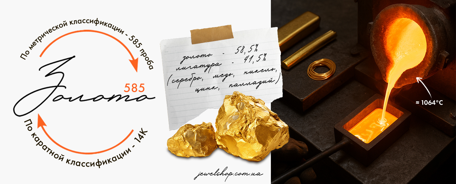 - Гарантия качества. Золото 585 и его характеристики во всех изделиях неизменны. В Украине и во многих других странах мира эта проба является общепринятым стандартом. Покупая украшение с клеймом «585», вы можете быть уверены в его составе и свойствах.