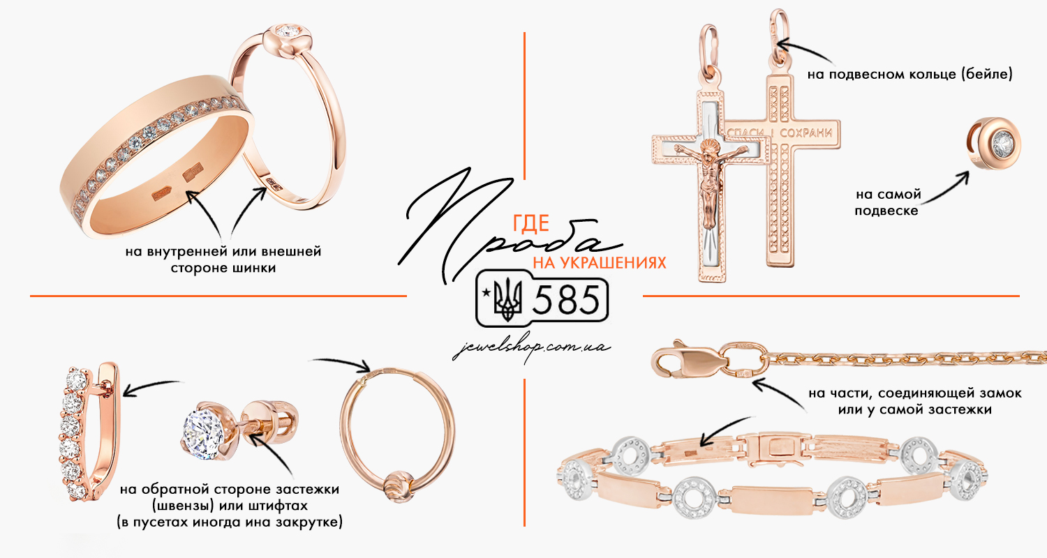 Перед поступлением в продажу на украшениях наносится специальное клеймо – прямоугольник с острыми углами. Внутри его размещаются цифры пробы (указывают количество граммов чистого золота в одном килограмме сплава). Также присутствует изображение трезуба – это знак, подтверждающий качество изделия отечественного производства.