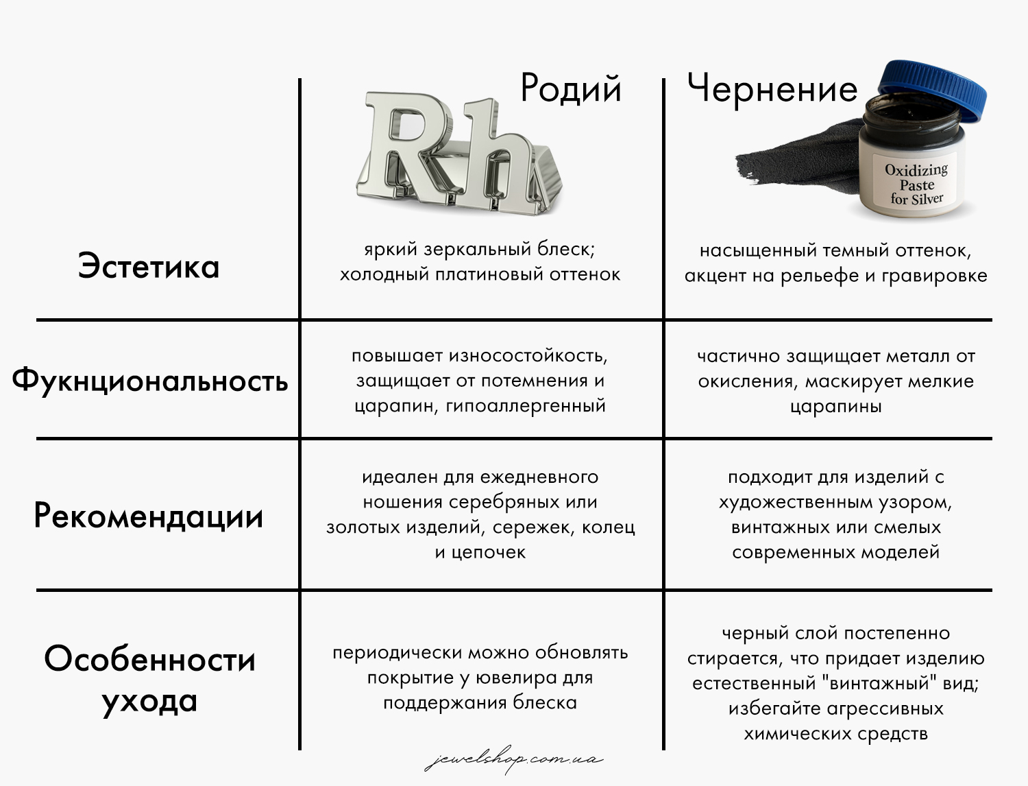 Выбор между родием и чернением зависит от цели, стиля изделия и условий эксплуатации. Каждое покрытие имеет свои преимущества и особенности, которые следует учитывать при покупке или заказе украшения. Если главная цель — долговечность и блеск, выбирайте родий. Если хочется выразительности, контраста и уникального стиля, оптимальным будет чернение. Мы подготовили небольшую сравнительную табличку как итог, чтобы облегчить ваш выбор.