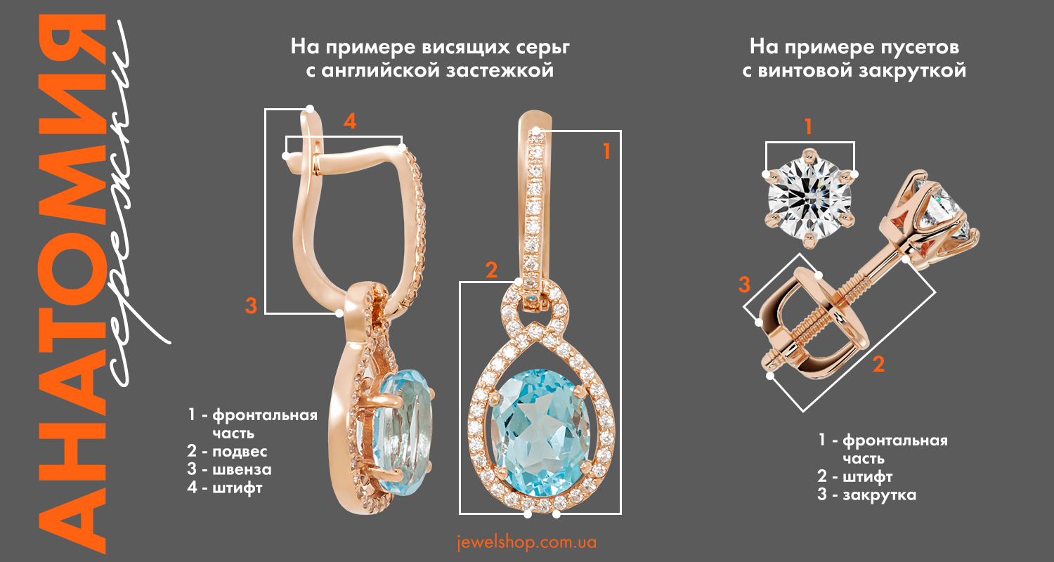 Удобные и красивые серьги всегда являлись фаворитами женских симпатий. Во многих случаях они сопровождают украинок всю жизнь – с первых месяцев до элегантного возраста. Приглашаем поближе познакомиться с вашими золотыми (или серебряными) «подружками»! Такая информация станет не только интересной, но и полезной. Она позволит быстро сделать обдуманный выбор, отвечающий требованиям и эстетическим предпочтениям. Зная строение сережки, вы сможете непринужденно (и понятно для продавца) выражать свои пожелания по поводу будущей драгоценности. Теперь не придется краснеть и рассказывать об «вот таком вот крючке» или «маленьком штырьке».