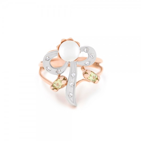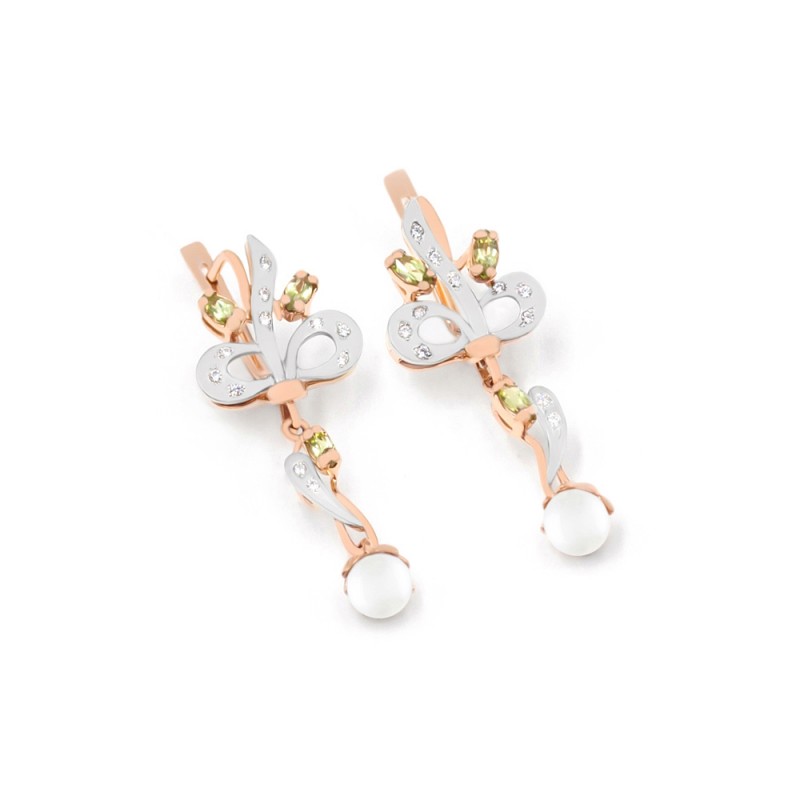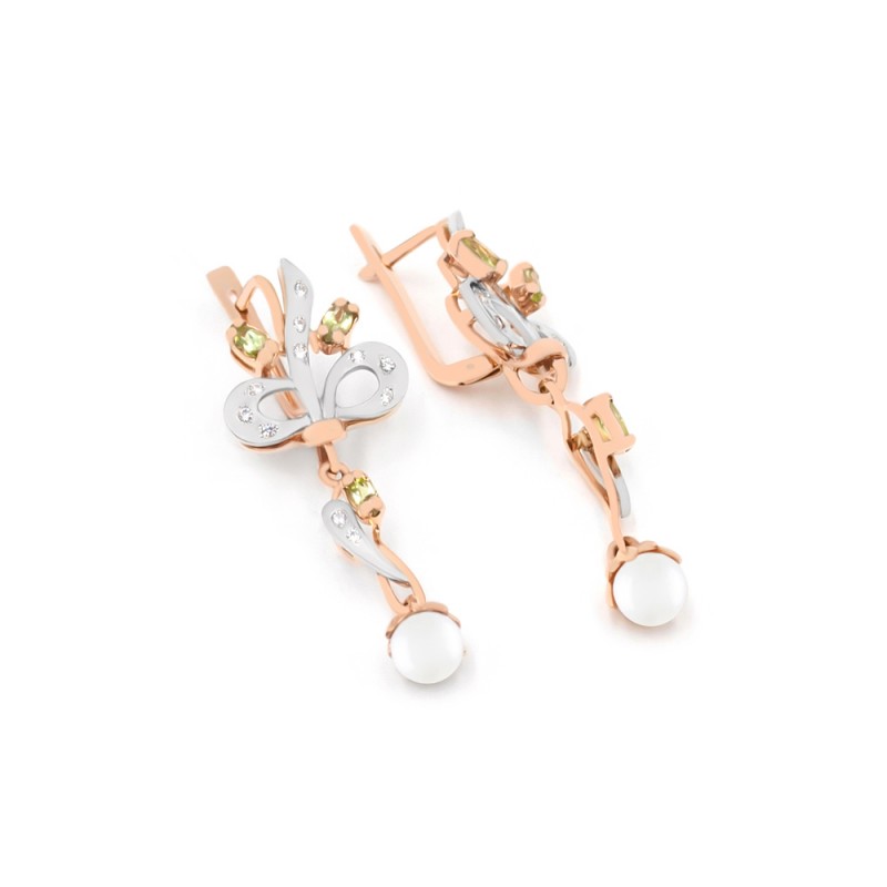 Сережки золоті з перлами, хризолітом та фіанітами 12026